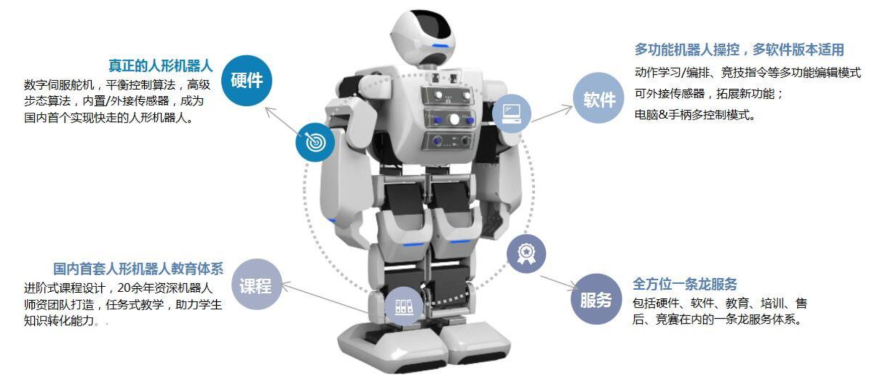 实现硬件和软件的完美结合,并融合 STEM 教育战略和创客教育理 念,首创任务驱动式教育课程,将仿人机器人完全融入教学场景,通 过前期应用、拓展、创新三个阶段的学习,让青少年接触到真正的机 器人技术。